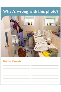 This photo illustrates a care worker preparing a bath for a client. It shows many hazards that may be encountered by a care worker while providing care in a client's bathroom. You can use these photos during safety meetings, or post them on the wall to encourage staff to spot the hazards.