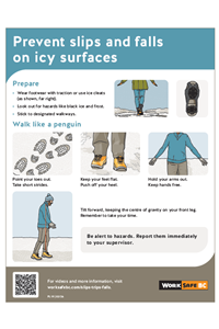 Slips and falls can result in serious injuries. The risk of slips and falls increases when surfaces are icy. This poster highlights practices that can help keep you safe in icy conditions.