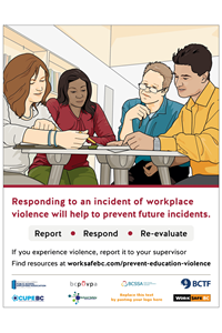 Violence can have a significant impact on the physical and psychological health and safety of workers. The four posters in this series are designed to remind workers, supervisors, and employers in the school system that they all have a responsibility to help prevent workplace violence. The posters emphasize the importance of reporting and responding to incidents of violence when they occur, and of re-evaluating prevention practices to help minimize the risk of future violence incidents.