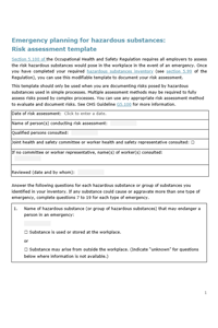If you’re an employer, you’re required to assess the risk that any hazardous substances would pose in your workplace if there was an emergency. This modifiable template includes key questions for you to consider as you conduct your risk assessment for any substances you identified in your inventory.