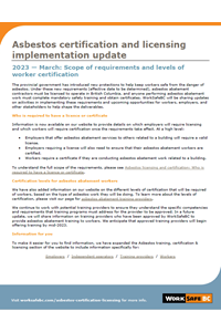 The provincial government has amended the Workers Compensation Act to establish requirements that asbestos abatement contractors must be licensed to operate in British Columbia, and that workers who perform this work must complete mandatory safety training and obtain certificates. WorkSafeBC will be providing quarterly updates on our progress in implementing these requirements.