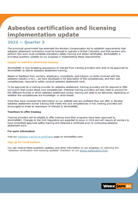 The provincial government has amended the Workers Compensation Act to establish requirements that asbestos abatement contractors must be licensed to operate in British Columbia, and that workers who perform this work must complete mandatory safety training and obtain certificates. WorkSafeBC will be providing quarterly updates on our progress in implementing these requirements.