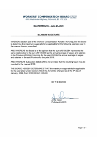 The June 24, 2021 Board Minute set the 2022 Maximum Wage Rate amount at $108,400.00, effective January 1, 2022.