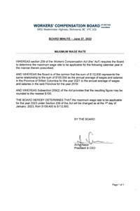 The June 27, 2022 Board Minute set the 2023 Maximum Wage Rate amount at $112,800.00, effective January 1, 2023.