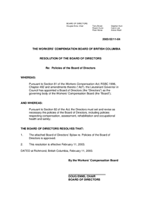 The Board of Directors approved a Bylaw re: Policies of the Board of Directors that contains an updated list of the policy manuals and other documents for the workers' compensation system.