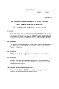 The Board of Directors approved an amendment to the Workers' Compensation Board's ("WCB") policy on casual workers, as provided in policy item #67.10 of the Rehabilitation Services & Claims Manual, Volume II. With respect to compensation matters, the WCB's previous policy was that longshore workers were treated as casual workers for the determination of average earnings. Upon reconsideration, the Board of Directors has determined that the reference to longshore workers should be removed from the policy so longshore workers are categorized according to their employment circumstances for purposes of determining average earnings. Therefore, effective March 18, 2003, the categorization of longshore workers for the determination of average earnings will be dependent upon their employment circumstances.