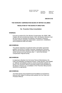 In August 2003 the Board of Directors approved the retirement of ten policies from the Prevention Division's Policy and Procedure Manual. The effective date for the retirement of the policies is September 1, 2003. On that date, the policies set out in Appendix "A" to the resolution ceased to be policy. The retirement of these policies is part of a larger project that will eventually result in all prevention policies being consolidated into the Prevention Manual and/or retired, as appropriate.