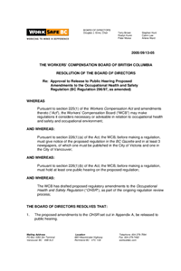 BOD Decision -2005/09/13-05 - Approval to Release to Public Hearing Proposed Amendments to the OHS Regulation