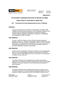 The Board of Directors approved changes to policy item #1.03 in Volumes I and II of the Rehabilitation Services & Claims Manual. This policy interprets section 35.1(8) of the Workers Compensation Act (“Act”). Section 35.1(8) is one of several transitional provisions setting out how WorkSafeBC must apply major amendments to the Act that came into effect on June 30, 2002. In particular, section 35.1(8) provides that if, on or after June 30, 2002, a worker has a recurrence of a disability that results from an injury that occurred before June 30, 2002, the current provisions of the Act apply.