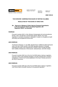 At its meeting on October 5, 2006, the Board of Directors approved the release of proposed amendments to Part 6 of the Occupational Health and Safety Regulation to public hearings being held in November 2006.