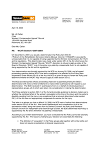At its meeting on March 19, 2008, the Board of Directors considered a decision of the Chair of the Workers’ Compensation Appeal Tribunal that policy item #40.00 of the Rehabilitation Services and Claims Manual, Vol. II, is so patently unreasonable that it is not capable of being supported by the Workers Compensation Act (“Act”) and its regulations. This determination was made under section 251(3) of the Act.