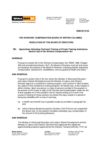On September 10, 2008, the Board of Directors approved a resolution providing that individuals registered as apprentices with the Industry Training Authority (“ITA”), attending ITA-approved apprenticeship technical training at ITA-designated private training institutions have coverage as workers of the Province under section 3(6) of the Workers Compensation Act.