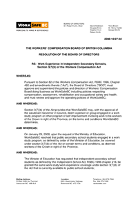 On October 7, 2008 the Board of Directors passed a resolution extending coverage under section 3(7)(b) of the Act to independent secondary school students engaged in work study programs as deemed workers of the Crown in right of the Province. This ensures students in independent secondary schools receive the same coverage and protection as students in public secondary schools while completing their work study/work experience graduation requirements.