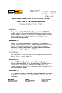 On October 11, 2012, the Board of Directors approved amendments to Items AP1-37-1, The Classification System, AP1-37-2, Classification — Multiple Industrial Activities, AP1-37-3, Classification — Changes, AP1-37-4 Classification — Consulting, and AP1-37-5, Deposit Accounts, of the Assessment Manual. The amendments introduce descriptions of key terms to the classification policies and consolidate policy direction on how to assign a classification unit to a firm.