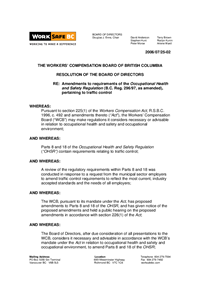 The Board of Directors approved amendments to the Occupational Health and Safety Regulation in July 2006. These approved amendments relate to the public hearings conducted in May 2006: Part 18, Traffic Control Rewrite of complete Part Part 8, Personal Protective Clothing and Equipment Section 8.24, High visibility apparel (consequential to proposed amendments to Part 18) Backgrounder The Board of Directors also approved an additional public hearing in the fall of 2006, as part of the 2006 regulatory process, to consider expanding the scope of the requirements in Part 6, Substance Specific Requirements, to include safety-engineered devices for all hollow-bore needles and other medical sharps.