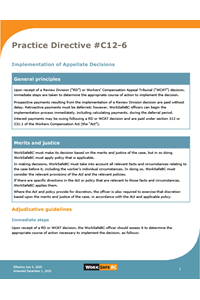 This practice directive provides guidance to WorkSafeBC officers regarding the implementation of Review Division (“RD”) and Workers’ Compensation Appeal Tribunal (“WCAT”) decisions. In particular, it expresses WorkSafeBC's commitment to ensuring timely implementation of appellate decisions.