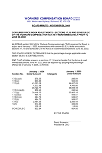 Section 35.2 of the Act requires the WCB to adjust dollar amounts in sections 17, 18 & schedule C of the Act as it read immediately prior to June 30, 2002. These adjustments are made annually, effective January 1, 2005. These adjustments are authorized by a Board Minute.