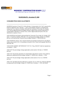 Sections 25 and 25.2 of the Workers Compensation Act ("Act") requires WorkSafeBC to determine the percentage change in the Consumer Price Index and adjust those periodic payments of compensation referred to in section 25(3) of the Act, and to adjust dollar amounts in the Act referred to in section 25.2(1). These adjustments are made annually, effective January 1, 2009. These adjustments are authorized by a Board Minute.