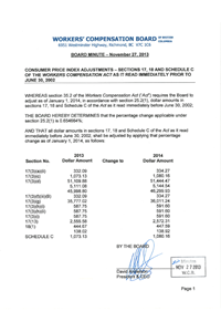 Section 35.2 of the Act requires WorkSafeBC to adjust dollar amounts in sections 17, 18 & schedule C of the Act as it read immediately prior to June 30, 2002. These adjustments are made annually, effective January 1. These adjustments are authorized by a Board Minute.