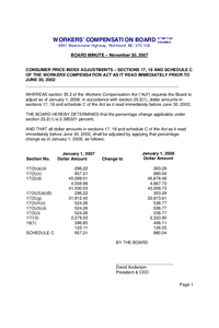 Section 35.2 of the Act requires the WCB to adjust dollar amounts in sections 17, 18 & schedule C of the Act as it read immediately prior to June 30, 2002. These adjustments are made annually, effective January 1, 2008. These adjustments are authorized by a Board Minute.