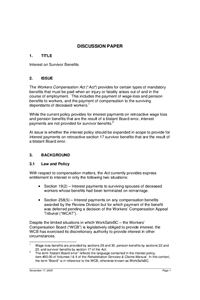 The Policy and Research Division developed a discussion paper on Interest on Survivor Benefits for consideration by stakeholders. At issue was whether the interest policy should be expanded in scope to provide for interest payments on retroactive section 17 survivor benefits that were the result of a blatant Board error.