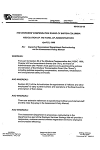 The Panel approved the amendment to the Assessment Policy Manual to incorporate changes in job titles of WCB staff performing registration, analysis, and account maintenance functions in the Assessment Department. The amendments primarily reflect the establishment of the Employer Service Centre staffed by employer services representatives.