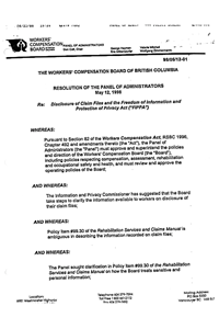 The Panel approved an amendment to Policy #99.30 of the Rehabilitation Services and Claims Manual. The amendment clarifies the type of information recorded on claim files and the WCB's treatment of sensitive and personal information. The policy now makes it clear that the claim file contains all evidence used in the adjudication of the claim. It also identifies that additional information may exist outside of the claim file and sets out a process for deciding whether sensitive information will be placed in the claim file. The change results from the Information and Privacy Commissioner's suggestion that the Board take steps to clarify its policy.