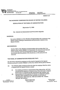 The Panel passed a resolution regarding the payment of interest on money returned to an employer following a successful appeal on an assessment or prevention matter. The resolution says that the WCB will pay interest to an employer from the date the employer filed the notice of appeal with the Appeal Division. There are three exceptions to this rule. In the following situations, interest will be paid from an earlier date than the date the appeal was filed: • Where there was a blatant error by the Board • Where the employer prepays a disputed penalty assessment pending the appeal • Where the appeal concerns cost relief on a historical section 39(1)(e) case In all cases, interest is paid at the same interest rate provided for compensation appeals (policy item 50.00 of the Rehabilitation Services and Claims Manual). The effective date of the resolution was October 13, 1998.