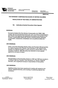 Policy 1.4.5 of the Prevention Division Policy and Procedure Manual provides for a right of appeal to the Director, Field Operations, with respect to the decision of a regional manager on orders issued by a Board officer. By resolution of April 23, 1998, this policy was extended to cover appeals against the non-issue of orders as well. To facilitate decision-making, the Panel has authorized the Vice-President, Prevention Division, to assign in writing to any director or assistant director in that Division with relevant expertise the appeal functions granted to the Director, Field Operations, under the policy.