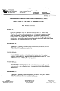 The Panel of Administrators has approved amendments to the Board’s policy on funeral expenses as provided in policy item #53.00 of the Rehabilitation Services and Claims Manual. The Board’s authority to pay for funeral expenses is provided by Section 17 of the Workers Compensation Act. This section was recently amended when Section 30 of the Labour Statutes Amendment Act came into force November 5, 1999. The amendment replaces the current fixed payments for funeral expenses with a general authority for these amounts to be determined by Board policy. In response to concerns regarding the inadequacy of the previous fixed payments, the Board has increased the amount available for funeral expenses, including incidentals, to $6,476.47, and the amount available for transportation of the body to $1,023.23. These amounts will continue to receive Consumer Price Index adjustments every six months. This increase in expense levels is consistent with the amounts recommended by the Royal Commission. The amendments came into effect on November 5, 1999.