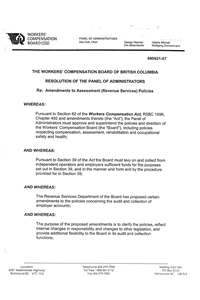 The Panel passed a resolution making changes to policies concerning the audit and collection of accounts. The purpose of these amendments is to clarify the policies, reflect internal changes in responsibilities, reflect changes to other legislation, and to provide additional flexibility to the Board in its audit and collection functions. The policies affected include the responsibility of B.C. contractors who hire out-of-province labour contractors to work in B.C., the inclusion of casual workers' earnings in assessable payroll, deductions for excess earnings from contractor's earnings, determining assessable payroll for active principals of corporations, equipment allowances for contractors, the role of the audit section, the cancellation of accounts, write-offs, bankruptcies, and payment proposals.
