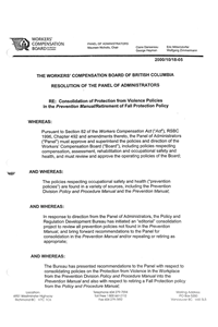 The Panel of Administrators approved the consolidation of the policies on Protection from Violence in the Workplace from the Prevention Division Policy and Procedure Manual into the new Prevention Manual. The affected policies are Policies No. 8.88 – 8.96. The effective date for the consolidated policies is December 1, 2000. On that date the consolidated policies became "published policy" and Policies No. 8.88 – 8.96 ceased to be "published policy". The consolidated policies appear in the new Manual format. They continue the substantive requirements of the Policy and Procedure Manual policies, as those requirements existed prior to December 1, 2000, with any wording changes necessary to reflect legislative and regulatory changes since the Policy and Procedure Manual policies were issued. The Panel has also approved the retirement of Policy No. 8.100 relating to the Fall Protection Regulations effective December 1, 2000. The first paragraph of Policy No. 8.100 was considered to be out of date. The second paragraph has been superseded by Item No. D2-111-1 (Assignment of Authority) in the Prevention Manual. The consolidation of the Protection from Violence policies and the retirement of the Fall Protection policy are part of a larger project that will eventually result in all prevention policies being consolidated into the new Prevention Manual or repealed or retired as appropriate.