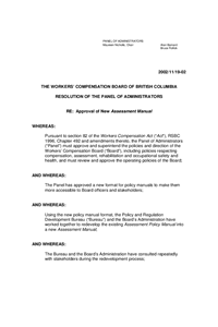 The Panel of Administrators adopted a new Assessment Manual to replace the existing Assessment Policy Manual effective January 1, 2003. The Assessment Manual is written in the new manual format. It represents an editorial consolidation of material from the existing Assessment Policy Manual and relevant and still current material from 29 assessment decisions in volumes 1 - 6 of the Workers' Compensation Reporter. Out-of-date practices and procedures have been removed and the material organized more logically. Some minor "substantive" changes have been made to make policy consistent with current practice or legal requirements.