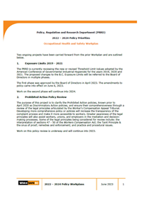 At the March 30, 2022 meeting, WorkSafeBC’s Board of Directors approved the Policy, Regulation and Research Department’s 2022–2024 Occupational Health and Safety Policy Workplan. In June 2023, the Workplan was updated to reflect the status of completed projects.