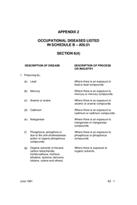 Appendix 2 is the occupational diseases listed in Schedule B (policy item #25.21, section 6(4)).