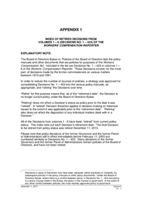 Appendix 1 is the index of retired decisions from Volumes 1–6 (Decisions No. 1–423 ) of the Workers’ Compensation Reporter (Item C12-96.00).